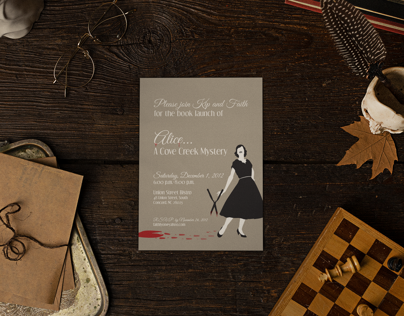 This custom-designed, printed invitation was created for the launch of Alice… A Cove Creek Mystery, a suspenseful murder mystery novel. The goal was to evoke the intrigue and drama of the story while offering guests a tangible, cinematic teaser of the event.