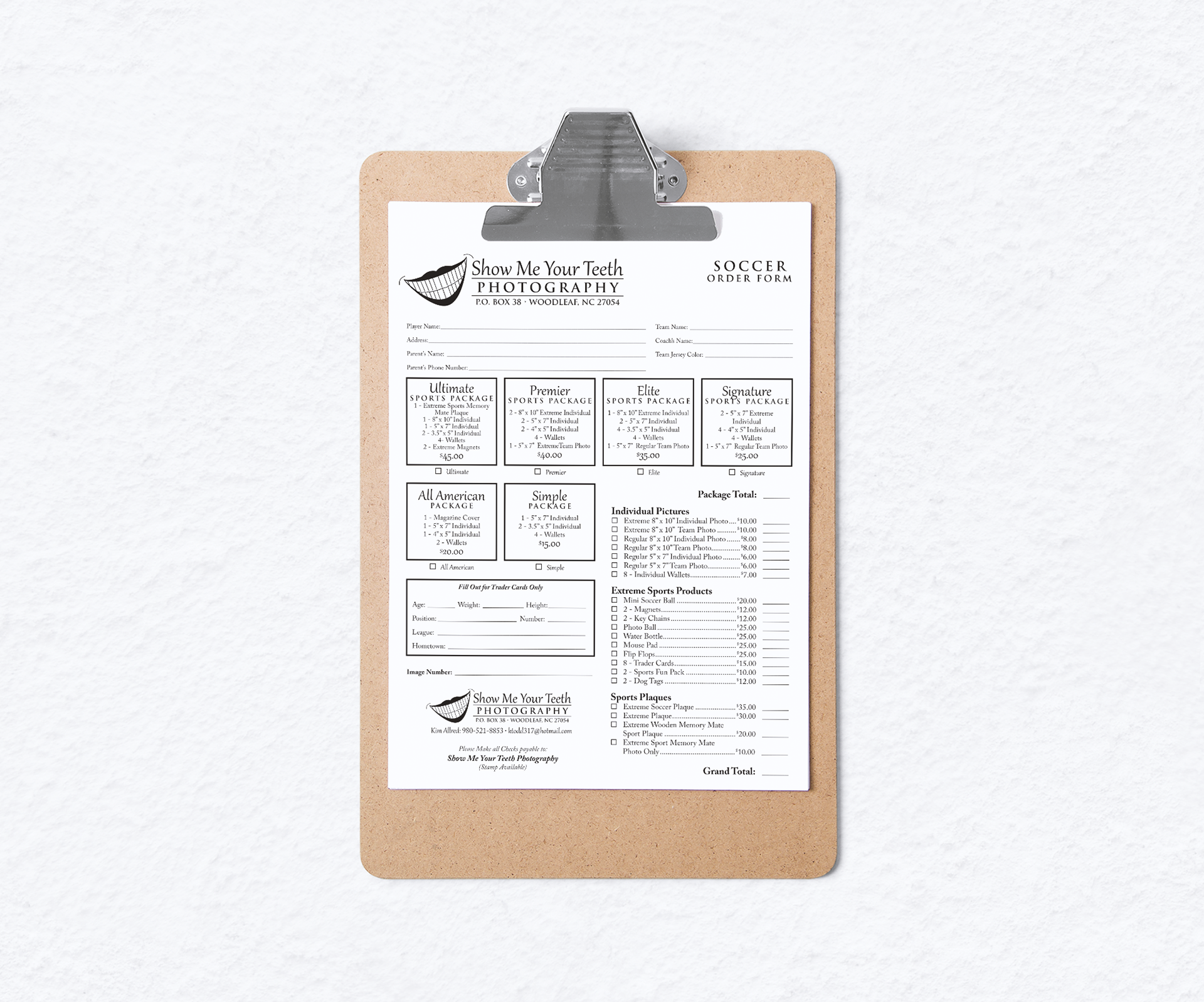 Logo design and order form for sports photographer.